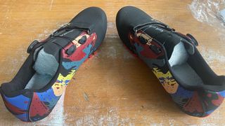 Zapatillas de ciclismo de montaña en talla 44. Presentan un diseño llamativo con detalles en varios colores. - Cierre con dial. - Suela con tacos para agarre. - Diseño multicolor sobre base negra.