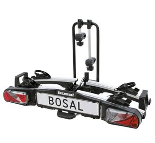 Portabicicletas para coche de la marca Bosal. - Diseño robusto y duradero. - Incluye luces traseras. - Placa de matrícula visible.