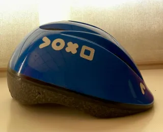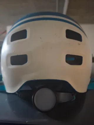 Casco infantil de la marca Btwin en color azul. Diseñado para proteger durante actividades deportivas. - Diseño en color azul. - Detalles blancos en los laterales. - Marca Btwin visible.