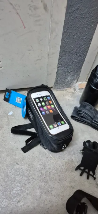 Lote de accesorios para bicicleta. - Bolsa porta móvil para manillar de bicicleta. - Cámara de aire para rueda de bicicleta. Luz varias ,disco Frenos, gafas,acople para móvil y botella