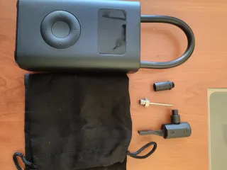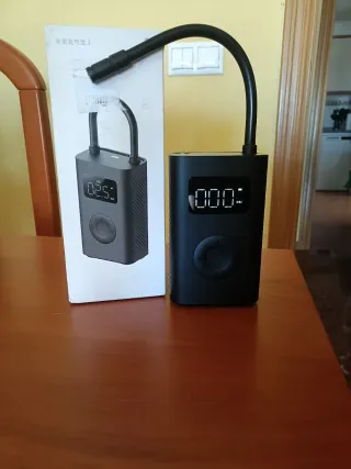 Compresor de aire portátil de la marca Xiaomi. Su diseño es compacto y moderno. - Color negro. - Pantalla digital. - Manguera flexible.