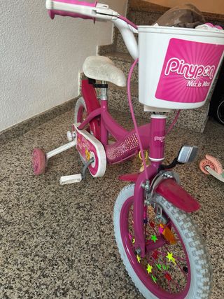 Bicicleta infantil de color rosa con diseño de Pinipon. Ideal para los más pequeños. - Ruedines de apoyo incluidos. - Cesta delantera. - Decoración con estrellas en las ruedas.