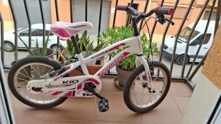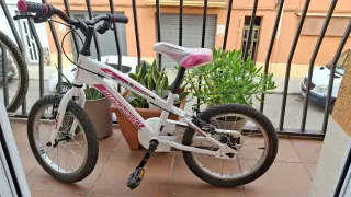 Bicicleta infantil de la marca Megamo, ideal para niños y niñas de 3 a 6 años. Ha tenido muy poco uso. - Ruedas de 16 pulgadas. - Color blanco con detalles en rosa. - Sillín y puños a juego.
