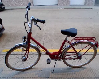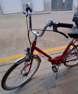 Bicicleta clásica BH de color rojo plegable. 50EUROS ES PRECIO FINAL - Freno trasero de tambor - Cambio de 3 velocidades - Cuadro de acero. - Ruedas de 60cm.de diámetro - Guardabarros delantero y trasero. - Portaequipajes trasero. - Faro delantero.