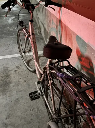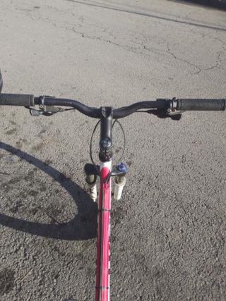 Bicicleta de montaña con manillar recto y horquilla delantera. - Manillar negro. - Puños negros. - Horquilla delantera con amortiguadores. - Cuadro de bicicleta en color rosa y blanco. PRECIO NEGOSIABLE!!!