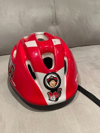 Casco infantil de color rojo y blanco, ideal para proteger a los más pequeños mientras van en bicicleta. Presenta divertidos dibujos. - Diseño llamativo en rojo y blanco. - Ilustraciones infantiles. - Correa ajustable.