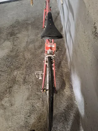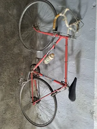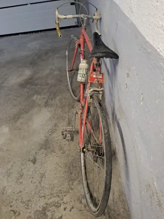 Bicicleta de competición antigua de color rojo. Ideal para coleccionistas o para restaurar. Mandar propuesta de precio por mensaje - Cuadro de metal. - Ruedas de radios. - Sillín negro. - Portabidón.
