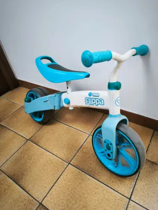 Bicicleta de aprendizaje Velo Flippa en color blanco y azul. - Diseño ligero y ergonómico. - Ruedas de goma. - Asiento ajustable. Posibilidad de triciclo con pedales o bicicleta sin pedales.