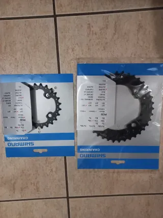 Platos Shimano para bicicleta, diseñados para transmisiones 2x10 velocidades. - Marca: Shimano - Configuración: 2x10 velocidades - Material: Metal - Color: Negro El plato grande es deore y el pequeño slx