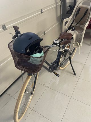Bicicleta urbana de color azul, ideal para paseos y desplazamientos diarios. Cuenta con una cesta delantera y una silla para transportar a un niño. - Cesta delantera. - Silla para niño. - Diseño clásico.