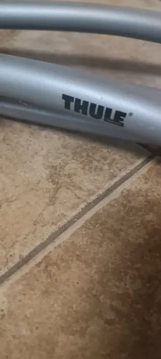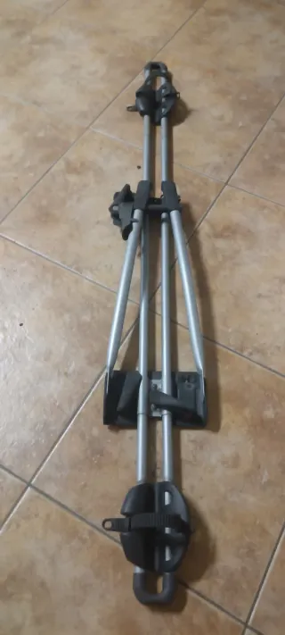 Portabicicletas de la marca Thule, diseñado para transportar bicicletas. - Estructura de aluminio. - Soportes de sujeción de plástico negro. - Correa de sujeción negra.