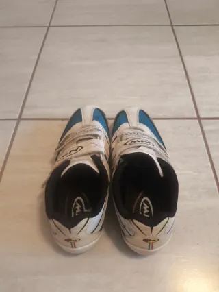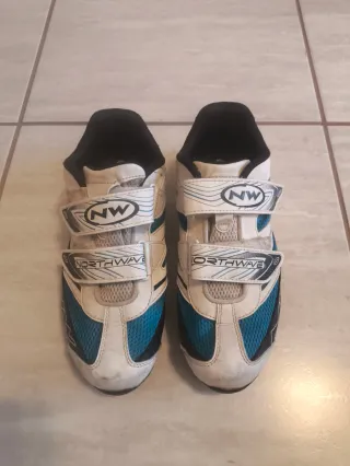 Zapatillas de ciclismo Northwave con cierre de velcro. Usadas pero en buen estado. - Color blanco, azul y negro. - Logo NW en la lengüeta. - Banda con nombre de la marca NORTHWAVE.