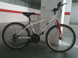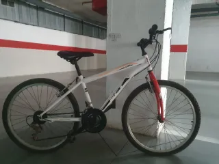 Bicicleta de montaña con un diseño deportivo perfecta para niño de 8-10 años - Cuadro de color blanco con detalles naranjas. - Horquilla delantera de color rojo. Únicamente ruedas desinfladas, la bicicleta en sí está bien