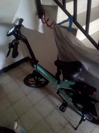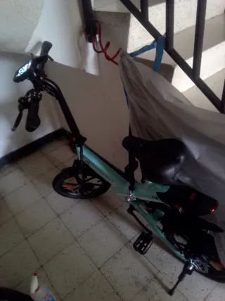 Bicicleta eléctrica en perfecto estado, ideal para desplazamientos urbanos. - Color verde menta. - Diseño plegable para fácil almacenamiento. - Ruedas de 16 pulgadas. - Pantalla LED en el manillar.