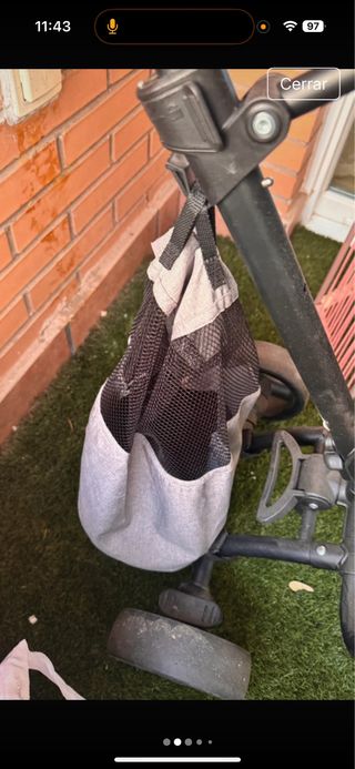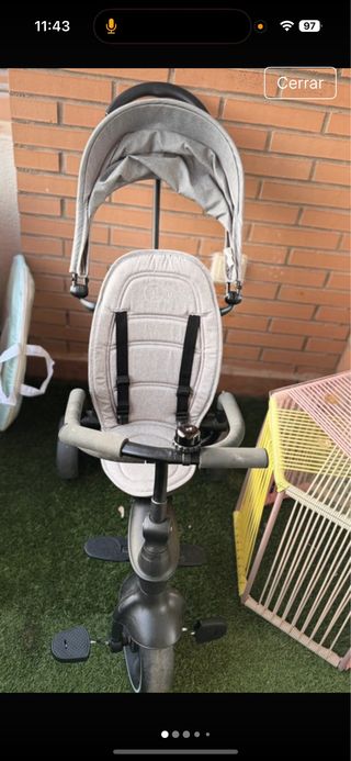 Triciclo infantil con capota y cinturón de seguridad. - Asiento acolchado. - Manillar con puños. - Reposapiés. - Rueda delantera con pedales. - Barra de empuje para adultos.