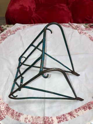 Portaequipajes vintage de hierro macizo, fabricado en los años 60, está hecho a mano. - Medidas: Alto: 34,5 cm Ancho: 38 cm - Peso: 1.310 kg. - Tiene cuatro enganches y tres agujeros para atornillarlo. - Material: Hierro. - Estilo: Retro. El objeto es un portabultos o portaequipajes para bicicleta, de estilo clásico y con un acabado patinado en azul verdoso. Se utiliza para transportar equipaje, alforjas o cestas en una bicicleta. El diseño parece compatible con bicicletas que tienen frenos de varilla. La estructura metálica muestra signos de desgaste y óxido, lo que le confiere un aspecto vintage.