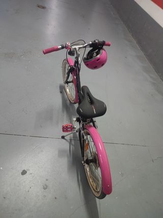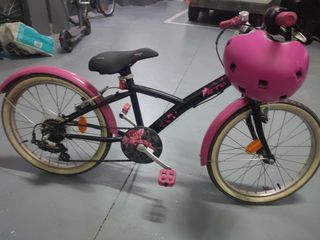 Bicicleta infantil BTWIN en color rosa y negro, ideal para niñas. - Diseño deportivo. - Ruedas de 20 pulgadas. - Sillín y puños rosas. - Cadena con protector.