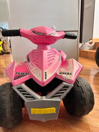 Quad eléctrico Feber de 6V en color rosa. - 5,5 kg - 40 minutos autonomía. - Diseño inspirado en un quad. - Ruedas todoterreno. - Volante con puños. - Pegatinas decorativas.