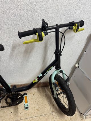 Bicicleta infantil de la marca Btwin, ideal para los más pequeños. - Color negro con detalles en amarillo y verde menta. - Ruedines incluidos. - Timbre incluido.