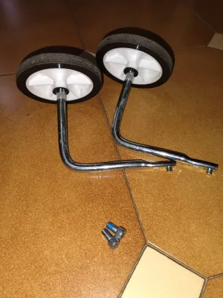 Ruedines de apoyo para bicicletas infantiles Decathlon. Ayudan a los más pequeños a aprender a mantener el equilibrio. - Fabricados en metal cromado. - Ruedas de goma negra con aro blanco. - Incluye tornillería para su montaje.