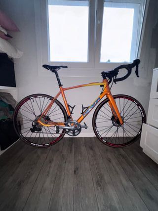 Bicicleta de carretera Mérida Ride 5000 en un llamativo color naranja con detalles degradados a amarillo. Cuadro carbono, bielas ultegra, cambio delantero y trasero 105 de Shimano. Frenos disco hidráulicos. Ruedas Progress de aluminio. Recién revisada y lista para salir a rodar. Talla M - Cuadro de carbono - Ruedas de 700c. - Frenos de disco. - Manillar de carretera.