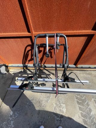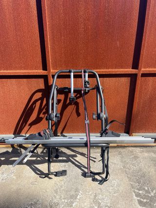 Portabicicletas de la marca Menabo, diseñado para transportar dos bicicletas. - Estructura robusta de metal. - Soportes ajustables para las bicicletas. - Correas de sujeción incluidas. falta un soporte de las ruedas y un tornillo del brazo que sujeta los cuadros. tengo otro brazo mas guardado