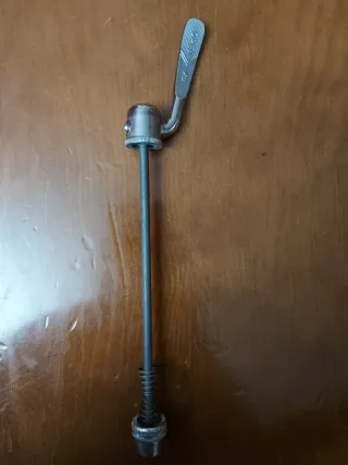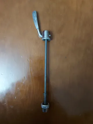 Cierre rápido de metal para bicicleta. Permite fijar y desmontar ruedas de forma sencilla. - Mecanismo de palanca. - Eje de metal.