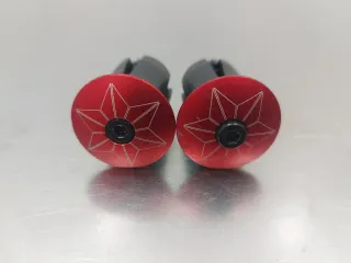 Set de tapones para manillar de bicicleta Supacaz. - Color rojo. - Diseño Star Plugz. - Acabado metálico.