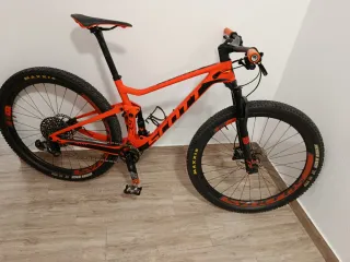 Bicicleta de montaña Scott spark RC tean 900 con cuadro de carbono y doble suspensión. con las llantas de carbono manillar integrado de carbono y tija de carbono talla M 2500€ - Color naranja y negro. - Ruedas Maxxis. - Horquilla RockShox.sid