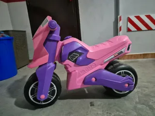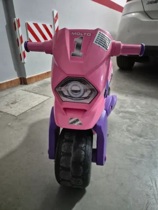 Moto de juguete de la marca Molto, con un diseño llamativo en color rosa y morado. - Ruedas grandes para mayor estabilidad. - Asiento ergonómico para comodidad. - Diseño inspirado en motos de carreras.