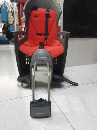 Silla infantil Hamax Smiley para bicicleta. Diseñada para el transporte seguro de niños. - Color rojo y gris. - Acolchado interior. - Arnés de seguridad. - Soporte metálico. - Marca Hamax. No bajo precio