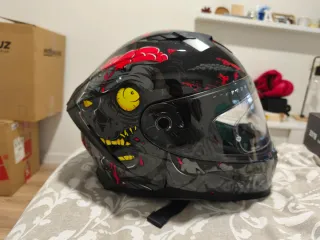 Casco integral Dexter con un diseño llamativo de zombie. - Talla XS. - Visera transparente. - Cierre de seguridad. - pinlock incluido y puesto - visera incorporada para el sol Lo vendo por mudanza.
