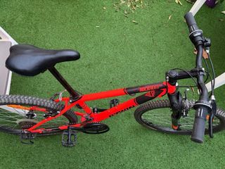 Bicicleta Btwin de color rojo, ideal para jóvenes ciclistas. - Cuadro de aluminio. - Ruedas de 24 pulgadas. - Frenos V-brake. - Cambio Shimano de 6 velocidades.