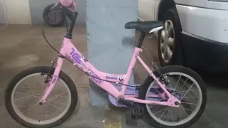Bicicleta infantil en color rosa y blanco, con cesta delantera. - Ruedas blancas con banda rosa. - Pedales rosas. - Guardabarros rosa. - Caballete lateral. Bicicleta en perfecto estando apenas usada, como nueva