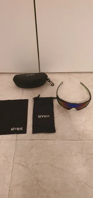 Gafas deportivas Uvex con funda y paño. - Montura negra y detalles en verde. - Incluye funda rígida. - Incluye funda blanda. - Incluye paño de limpieza.