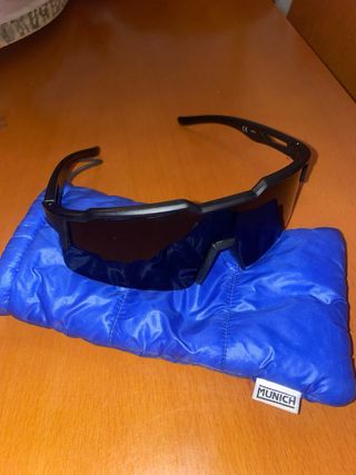 Gafas deportivas de color negro. Perfectas para actividades al aire libre. - Diseño deportivo y moderno. - Montura resistente felixible. - Lentes oscuras. junto a una funda MUNICH