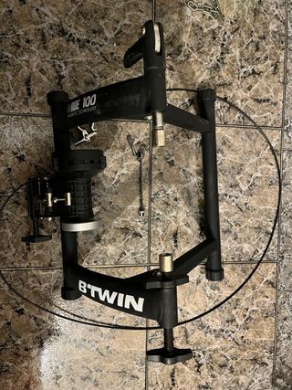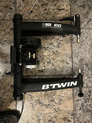 Rodillo de entrenamiento B'Twin In Ride 100. - Compatible con bicicletas. - Incluye cable y mando. Compatible con todas las ruedas de 26-28 pulgadas con un eje hueco. Eje 16. No se negocia el precio. Recogida en Mataró.