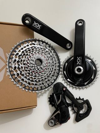 Grupo de componentes SRAM XX SL con potenciómetro. - Bielas SRAM XX SL 175 plato 34 4 salidas - Cassette xx con 4 salidas - Cambio trasero SRAM XX SL. x01 xx1 gx t type shimano xtr mtb xt slx axs eagle fox rockshox darimo trek scott orbea mondraker ktm btt sram specialized btt mtb cannondale 12v