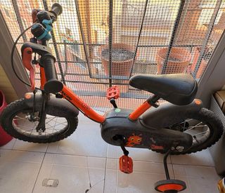 Bicicleta infantil de color naranja con detalles en negro. Ideal para los más pequeños. - Cuadro de metal. - Ruedas todoterreno. - Sillín ajustable. - Para recoger en Madrid, zona Barrio del Pilar. - Con un poco de polvo pero buen estado