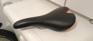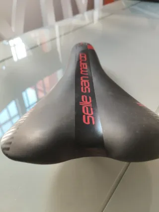 Sillín de bicicleta San Marco modelo Monza. Diseño deportivo con detalles en rojo. Color negro. Detalles de rayas rojas y negras en la parte trasera. Logotipo de San Marco en rojo. Pequeño desperfecto en la parte delantera no es debido a una caída sino que el perro le dió por jugar con la bicicleta. Ya nunca más volvió a morder la bicicleta. Sillín original
