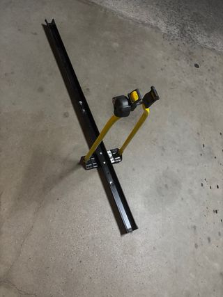 Portabicicletas de color negro y azul. - Fabricado en metal y plástico. - Diseño ajustable. - Solo usado una vez.