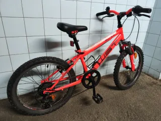 Bicicleta Orbea de color rojo, ideal para niños. Como se puede apreciar está sucia de tenerla guardada. - Cuadro de aluminio. - Ruedas de 20 pulgadas. - Frenos V-brake. - Cambio Shimano de 6 velocidades.