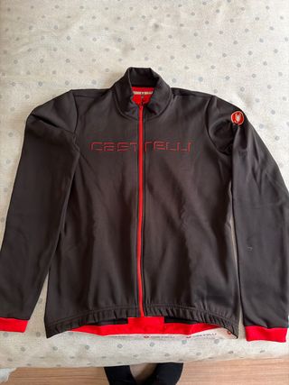 Chaqueta de ciclismo Castelli para hombre, ideal para el invierno. Presenta un diseño en color negro con detalles en rojo. - Logo de Castelli en la manga. - Cremallera frontal roja. - Puños y cintura con detalles rojos. - Original - pequeño roce en codo izquierdo no ha calado, se puede ver en la foto - muy caliente