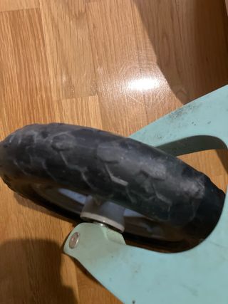 Bici de aprendizaje de madera con un diseño inspirado en las vespas. - Color principal verde menta. - Asiento y puños en color rojo. - Ruedas negras. No tiene casi uso pero en la mudanza se pico un poco, le hace falta limpiar por estar guardada