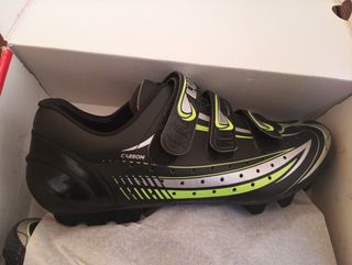 Zapatillas de ciclismo de la marca Luck. - Color negro con detalles en verde lima y plateado. - Cierre con velcros. - Talla 45. - Fabricadas en España.
