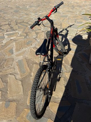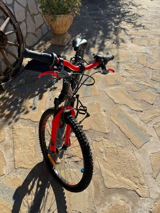 Bicicleta infantil de la marca B'Twin en color rojo. - Cuadro de metal resistente. - Ruedas todoterreno. - Suspensión delantera y trasera.
