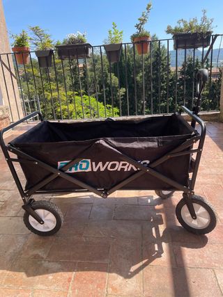 Vendo carro de transporte Proworks plegable. Está en buen estado y es perfecto para llevar objetos de un lugar a otro. - Carro de mano plegable. - Estructura metálica resistente. - Tejido de poliéster resistente. - Cuatro ruedas para facilitar el transporte.