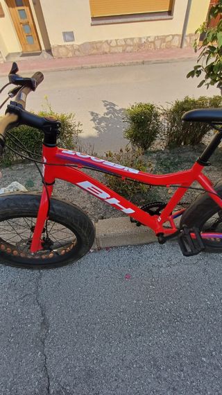 Bicicleta BH de color rojo, ideal para niños de 6 a 8 años. Cuenta con ruedas anchas tipo fat bike para mayor estabilidad. - Cuadro de aluminio. - Frenos de disco. - Cambio Shimano. -7 marchas
