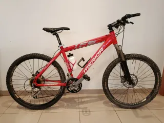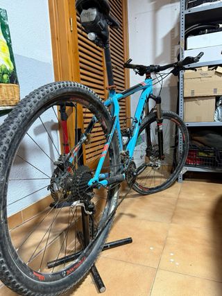 Trek X-Caliber 9 de aproximadamente 2015, en talla L/XL (ideal para personas de 1,80 m a 1,90 m aprox.) Bicicleta de montaña hardtail de aluminio y ligera 🔧 Características principales • Cuadro: Aluminio Alpha Gold, geometría G2 para ruedas 29” • Suspensión delantera: RockShox XC32 Solo Air, recorrido 100 mm, bloqueo en manillar • Transmisión: Monoplato 1x10 (1 plato delantero y 10 piñones traseros) • Frenos: Hidráulicos Shimano M447 • Ruedas: Bontrager Mustang Elite 29” • Neumáticos: Bontrager XR1 29×2,20 • Peso aprox.: entre 13 y 14 kg