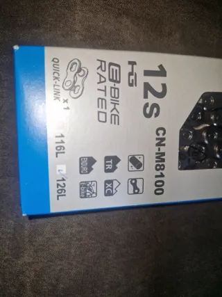 Cadena Shimano CN-M8100 de 12 velocidades, diseñada para e-bikes. - Modelo: CN-M8100 - Velocidades: 12s - Compatibilidad: E-BIKE RATED, HG - Incluye: 1 x QUICK-LINK - Longitud: 116L o 126L
